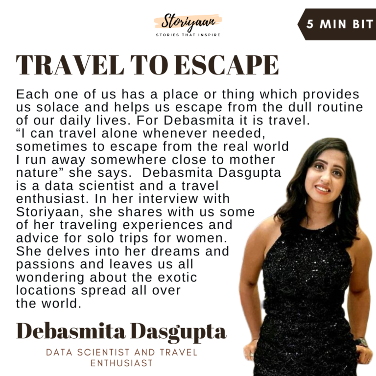 Debasmita Dasgupta is a data scientist and a travel enthusiast. In her interview with Storiyaan, she shares with us some of her traveling experiences and advice for solo trips for women. She delves into her dreams and passions and leaves us all wondering about the exotic locations spread all over the world.