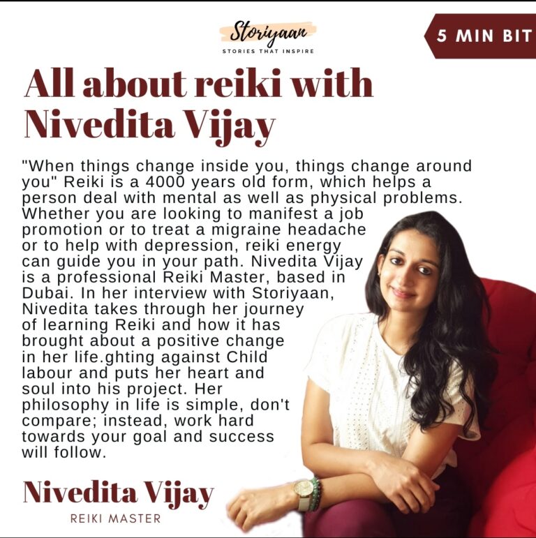“When things change inside you, things change around you”. Reiki is a 4000 years old form, which helps a person deal with mental as well as physical problems. Whether you are looking to manifest a job promotion or to treat a migraine headache or to help with depression, reiki energy can guide you in your path. Nivedita Vijay is a professional Reiki Master, based in Dubai. In her interview with Storiyaan, Nivedita takes through her journey of learning Reiki and how it has brought about a positive change in her life.